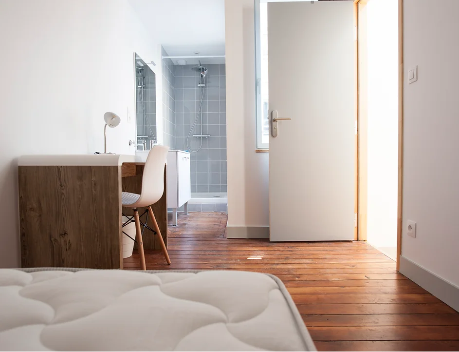 A chaque étage, du rez-de-chaussée au R+4, se trouve des colocations comprenant au maximum 5 chambres avec salle d'eau privative, bureau et armoire.