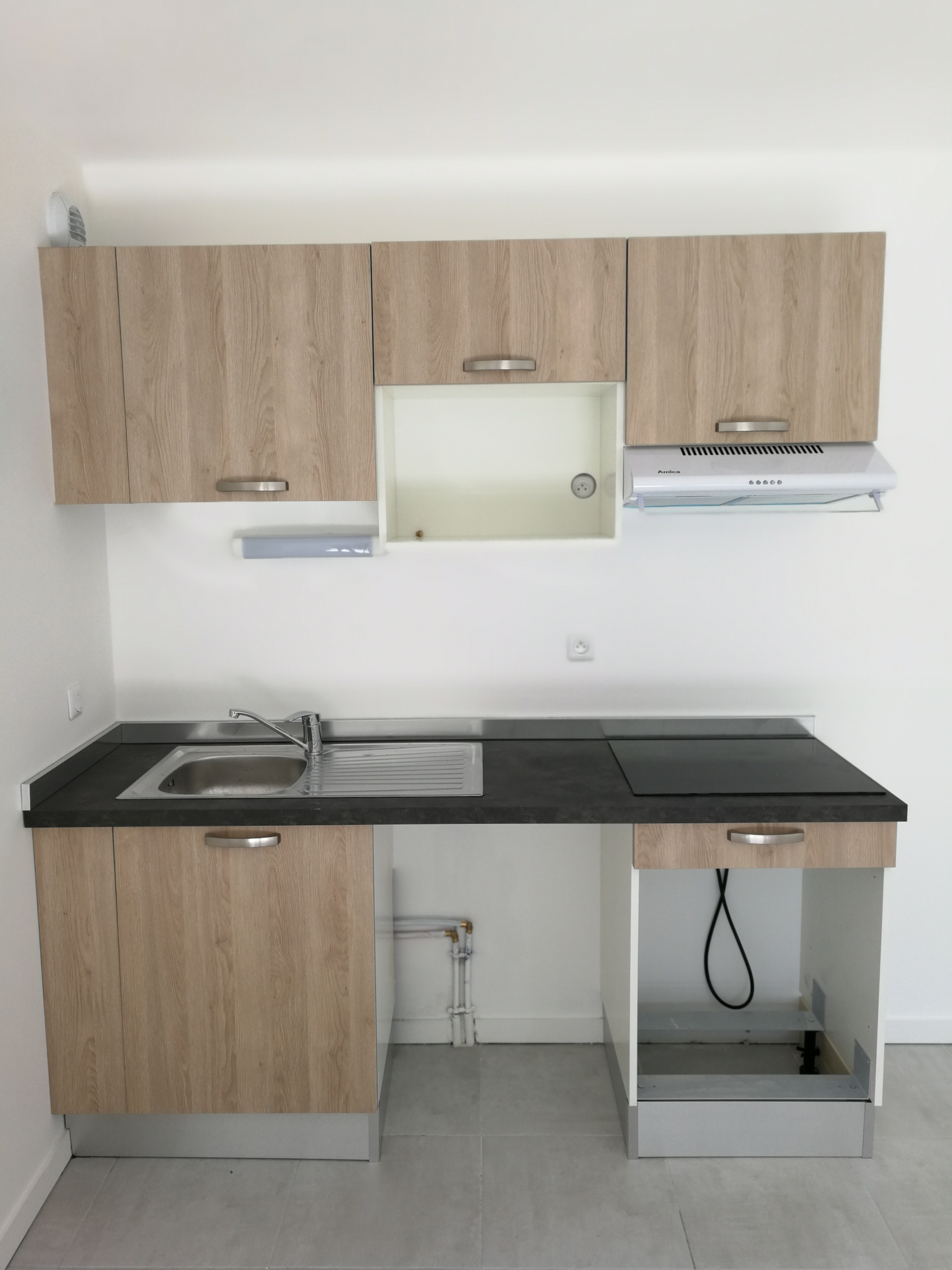 L'appartement comprend entrée, pièce de vie, cuisine ouverte, deux chambres et salle de bains avec WC.
