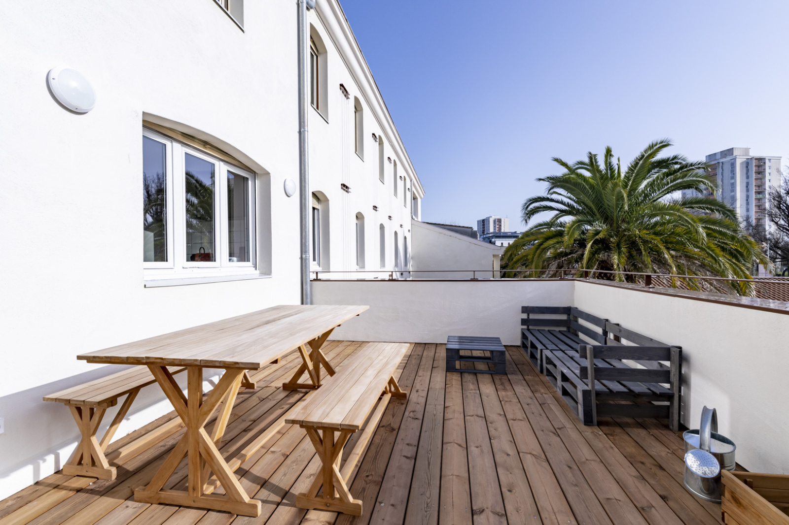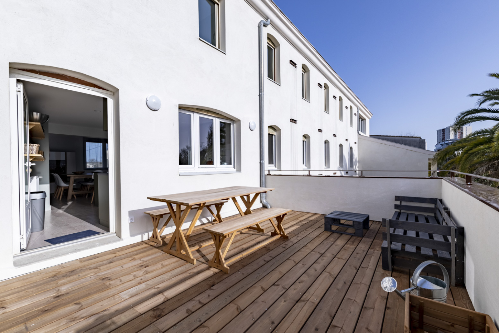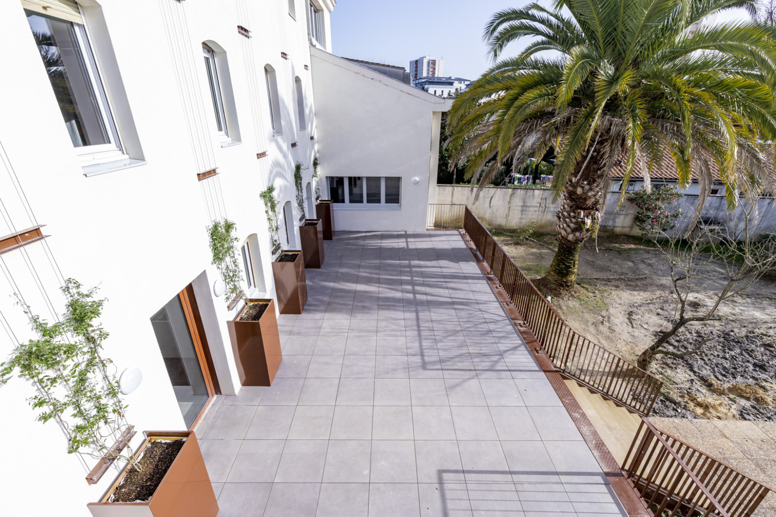 7 chambres avec bureau et placard pour le coin nuit et une pièce de vie traversante offrant l'accès à une terrasse privative desservant le jardin commun de la résidence.