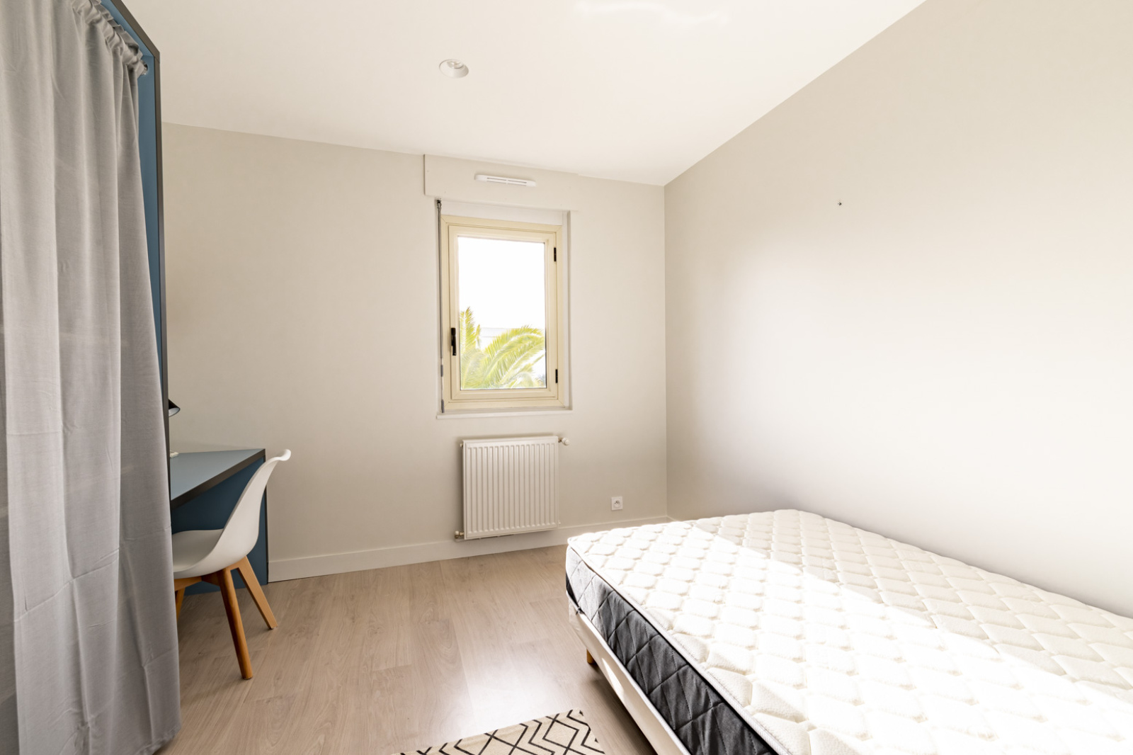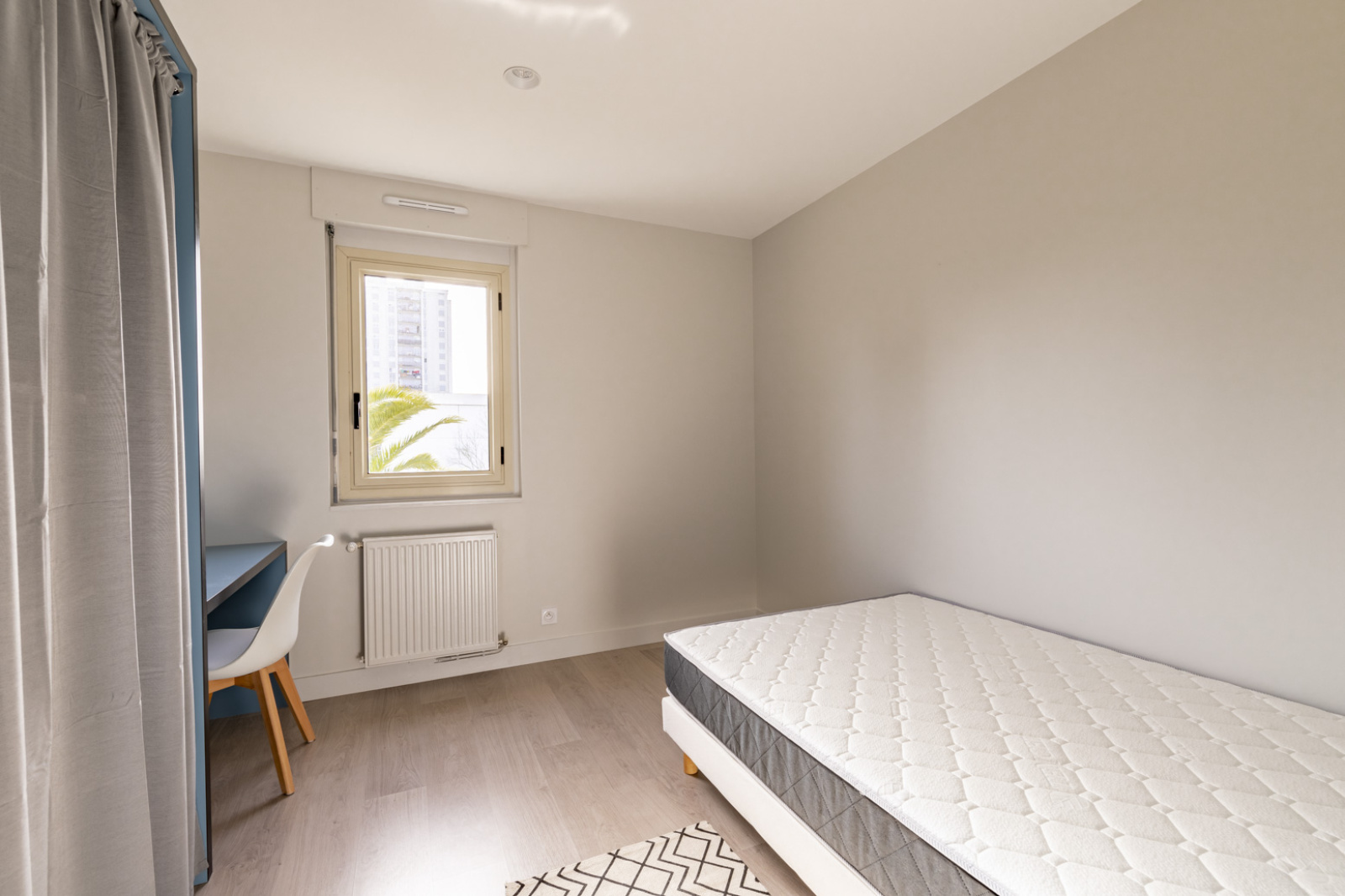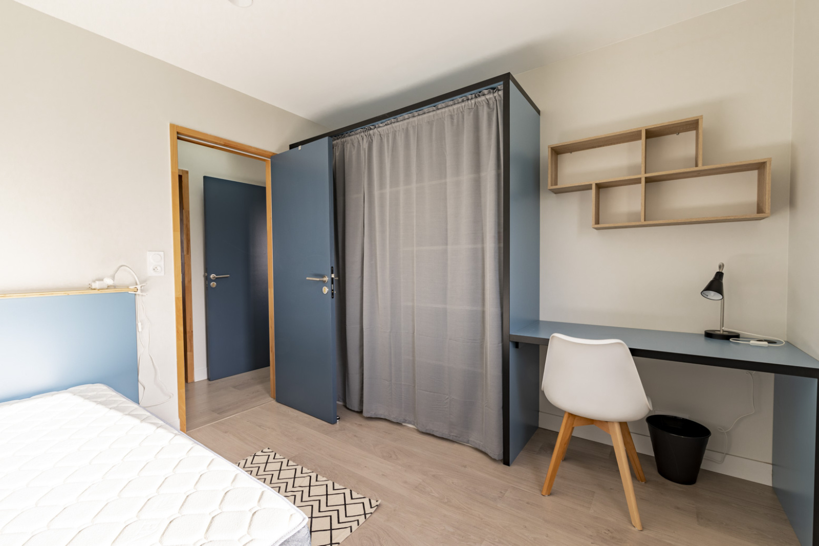Logement entièrement meublé et équipé (tout ce qu'il vous faudra pour cuisiner, laver et sécher votre linge, entretenir les lieux), chambres meublées d'un bureau, de placards, d'étagères.