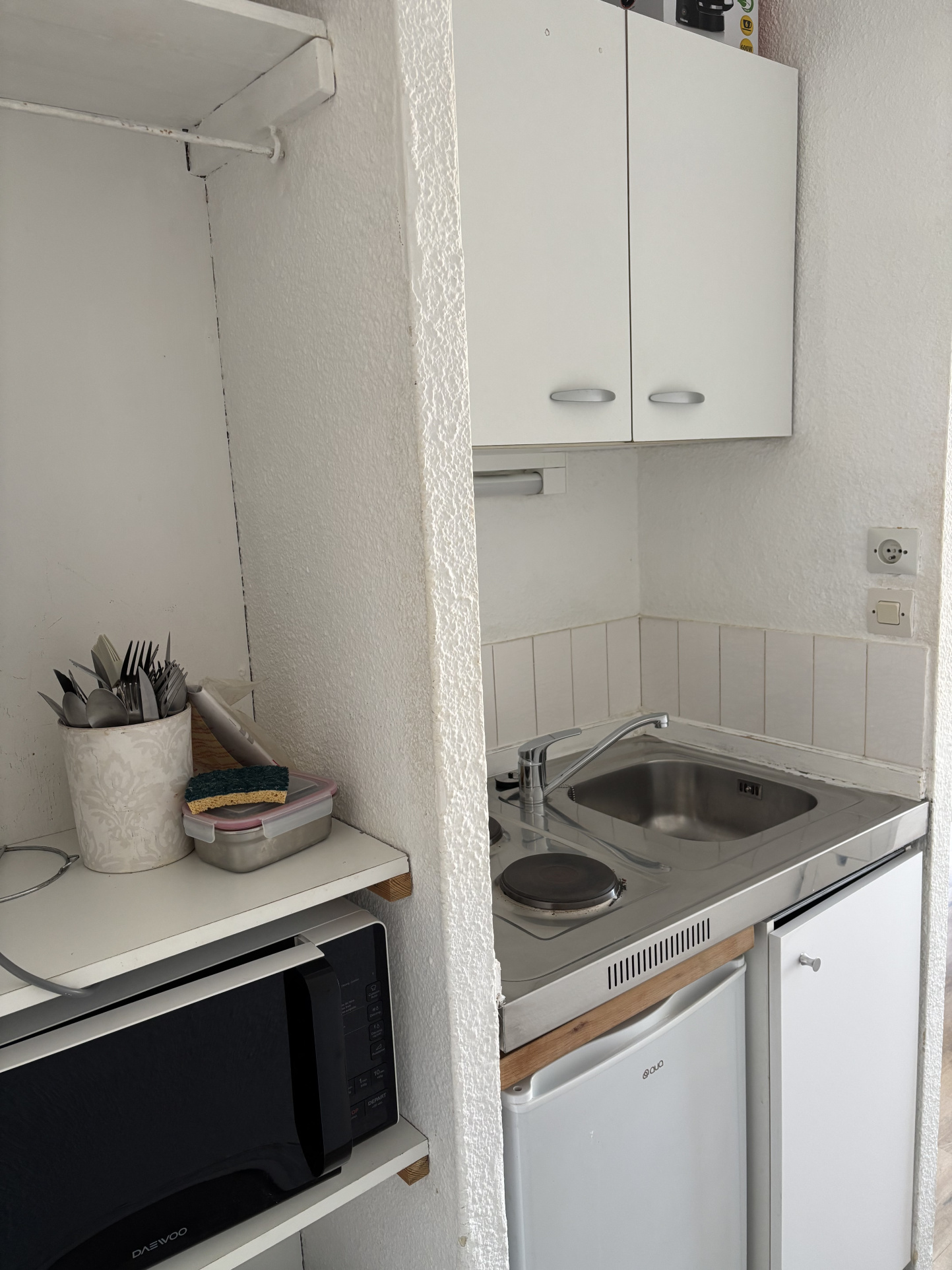 L'appartement comprend entrée avec kitchenette, balcon, pièce de vie et salle d'eau avec WC.